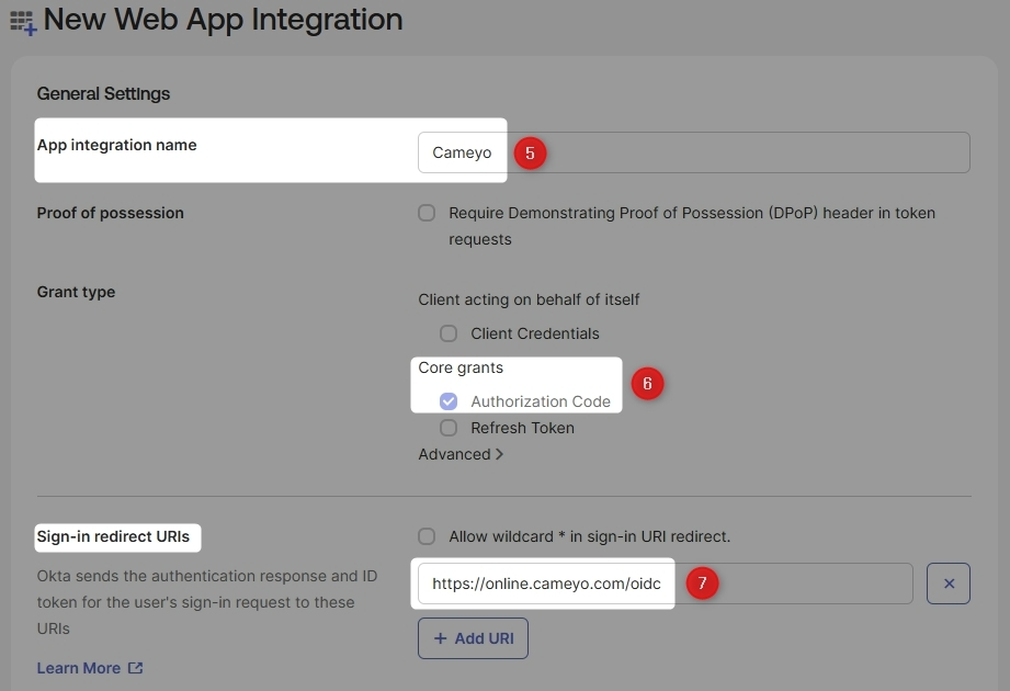 Only Authorization code is neededSet the Sign-in redirect URI to https://online.cameyo.com/oidc (ALWAYS use online.cameyo.com, never your company's subdomain!)